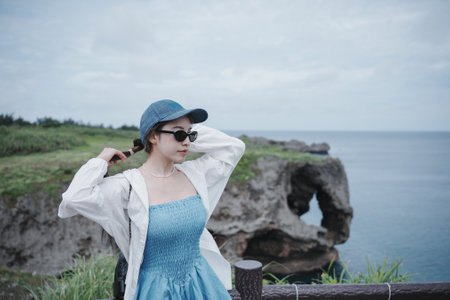 Woman enjoy view landscape of cape manzamo, okinawa, japan.