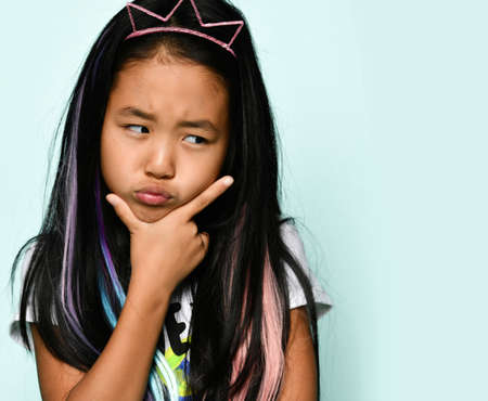 Close up portrait of capricious brunette girl in crown hoop and with colored strands in hair on blue background. Concept image for articles about children's tantrums and whims. Banner. Place for text.