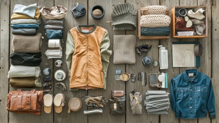 A neat flat lay arrangement of travel essentials on a wooden surface, including clothes, shoes, a phone, a camera, a map, and toiletries. This composition represents travel preparation, organization, and readiness for a vacation.