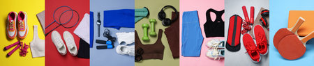 Sports equipment and clothes on colorful background, set. Top view