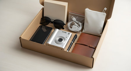An open cardboard box displaying a neatly organized collection of travel essentials, including sunglasses, a compact camera, a smartphone, a notebook, and charging cables. The composition represents preparation for a trip or an unboxing concept.