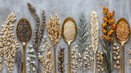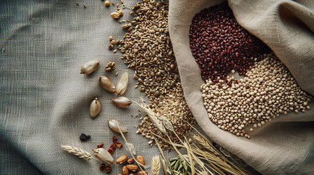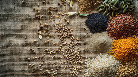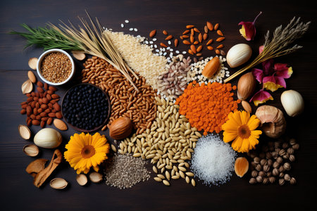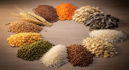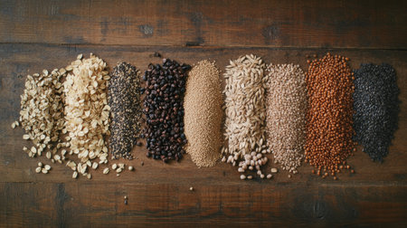 Flat Composition of Grains, seeds and cereals laid out on a wooden surface