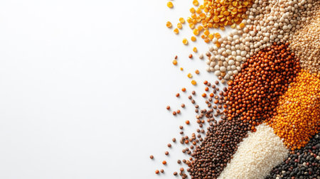 Top view of assorted grains and legumes, with space for text on a clean white background