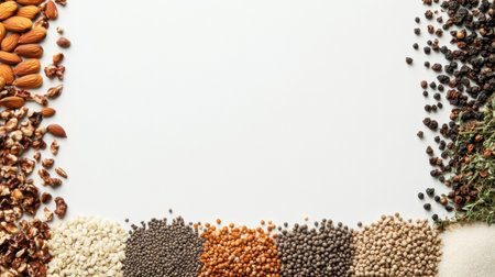 Various organic seeds, nuts, and herbs are neatly arranged on a white surface, providing ample empty space for text and information.