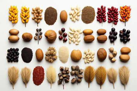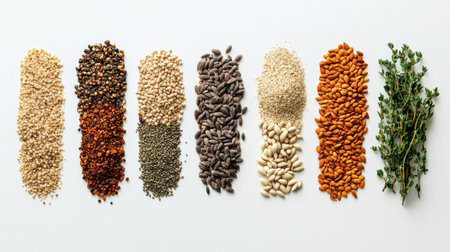 Organic seeds, nuts, and herbs are artistically arranged on a white background, creating an opportunity for text or branding.