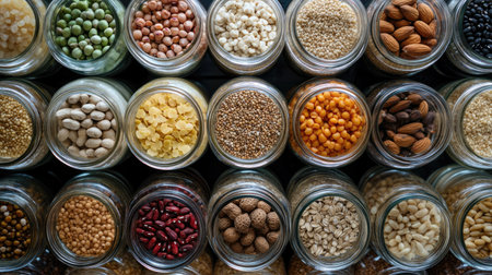 A diverse selection of grains, nuts, and legumes displayed in jars, emphasizing the importance of plant-based diets on World Food Day.