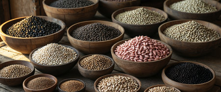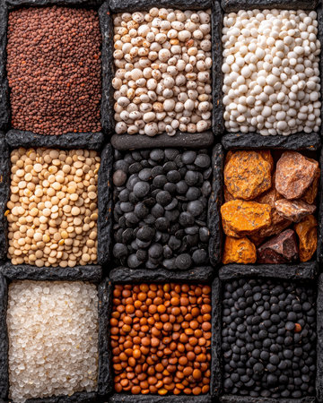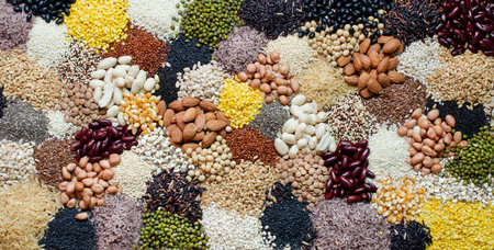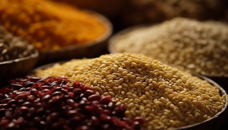 This image showcases a stunning display of various grains and pulses, featuring a rich palette of colors and textures, perfect for culinary inspirations.