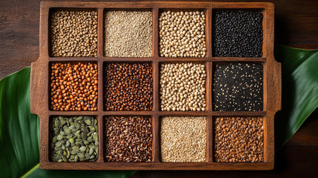 This captivating top view image features an array of assorted grains and seeds beautifully arranged in colorful bowls on a rich wooden board, perfect for illustrating healthy eating and culinary practices.