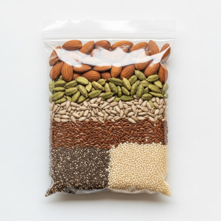 Mixed nuts and seeds in a clear bag, isolated on white background