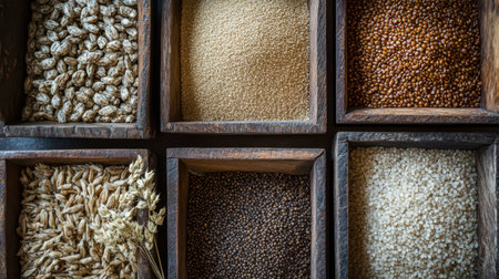 Different types of spices and grains are arranged in wooden boxes, showcasing their textures and colors. The arrangement highlights the diversity of culinary ingredients available for cooking.
