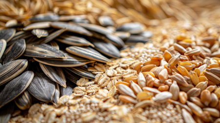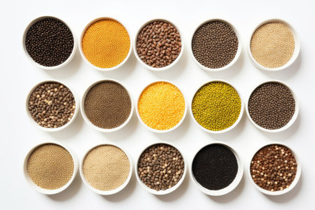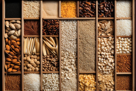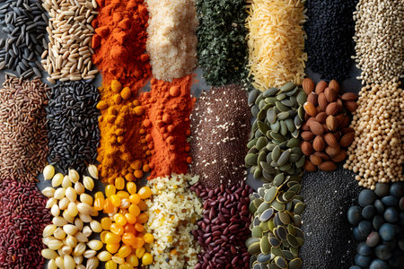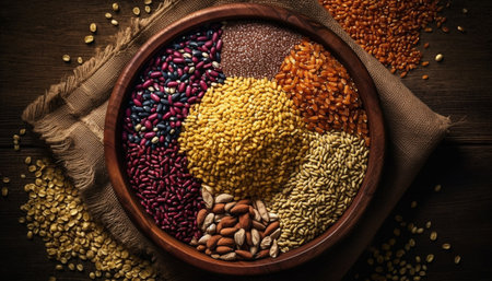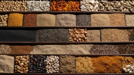 An AI-generated illustration of a colorful assortment of cereals, beans, and seeds.