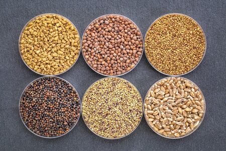 set of organic sprouting seeds in Petri dishes, counterwise from top left - fenugreek, radish, alfalfa, red clover and hard wheat