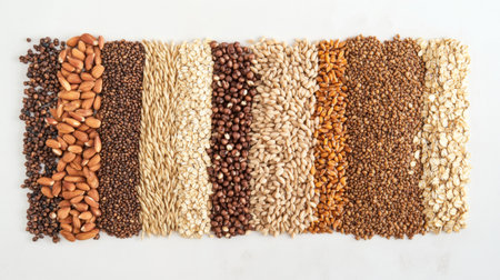 An assortment of single-grain types such as brown rice, wheat berries, and steel-cut oats, arranged in a visually appealing pattern on a white background.