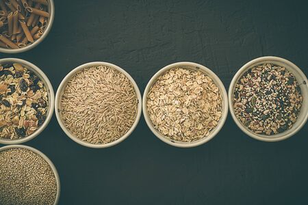 Quinoa, brown rice, seeds and oats in a bowl. Whole grain and organic food concept for vegetarians