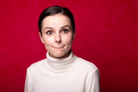 young female is surprised and dumbfounded, he looks at the camera with a stupid expression on face. man with intense expression
