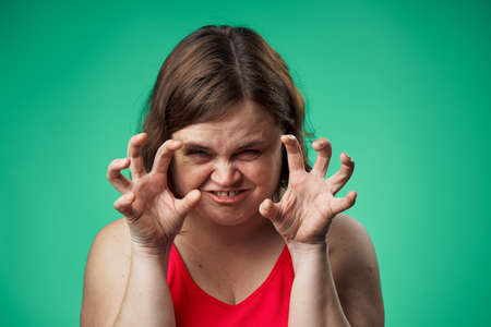 Funny ugly hispanic adult woman smile from a silly joke. Moron and dumb face portrait with mad gesture