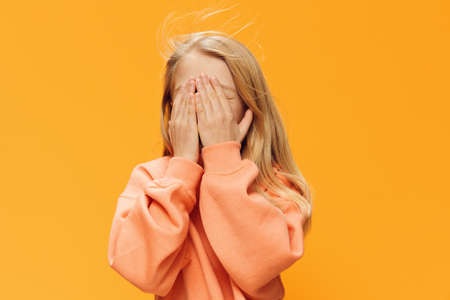 a happy beautiful girl, blonde, of school age, stands on a yellow background in bright clothes covering her face with her palms