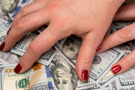 Earn money, get a good revenue. A female hand and a lot of cash,