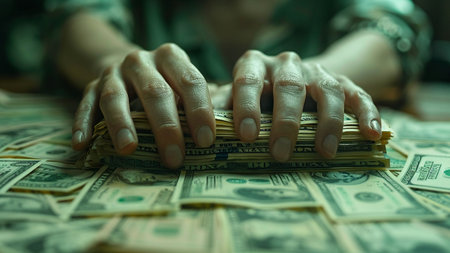 A close-up of hands counting a large stack of cash on a wooden table. The image captures the essence of financial transactions and money management.ai generated.