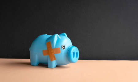 Broken piggy bank with band aid bandage on top of table. Broke, bankrupt or recession concept.