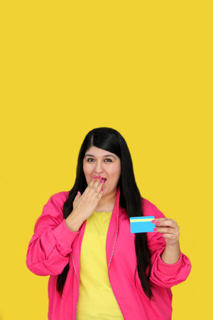 Young adult woman of 30 years old uses her credit card to take advantage of promotions and discounts on purchases, travel payments, beauty products, supermarkets and online