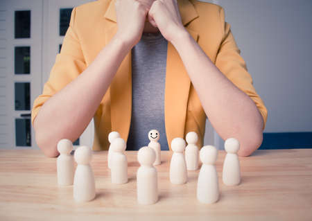 closeup businesswoman hand pointing on happy emotion face wooden doll arranged on table for satisfaction survey, mental health assessment