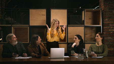 She gets pissed off when things dont go her way. a senior businesswoman screaming in anger during a meeting in an office with paperwork falling around.