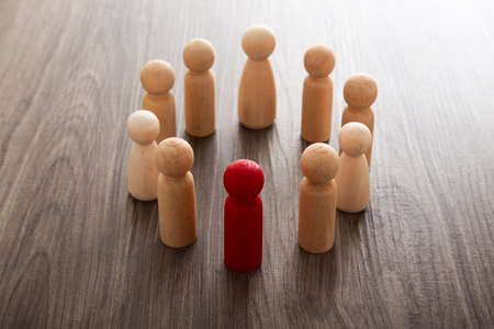 Red wooden figure stepped out to in front of line to leading with each other figure and show different thinking ideas. Leadership and disruption for new normal concept.