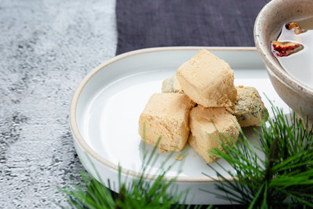 Warabi-mochi or Kinako mochi, bracken-starch dumpling with brown sugar syrup on vintage background. Japanese dessert made up from rice powder