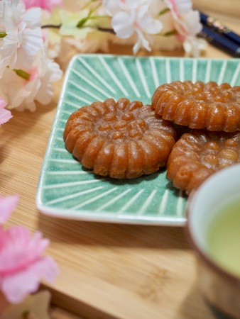 Korean traditional sweets Yakgwa and green tea and cherry blossom