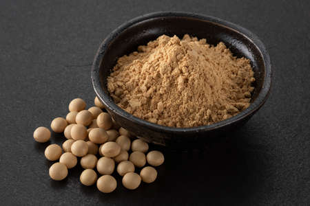 Roasted soybean flour and soybeans on black background.