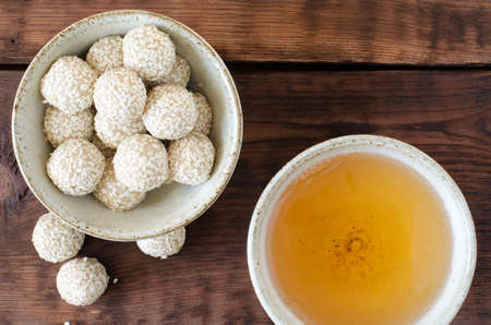 Handmade sesame seed balls and green tea in bowl on wooden background. Top view.