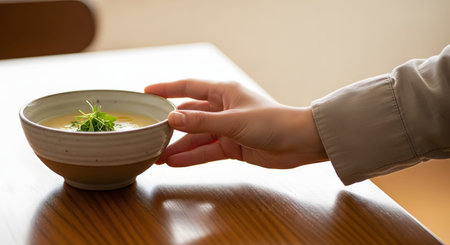 A person's hand slides a ceramic bowl of creamy soup garnished with greens across a polished wooden table. The gesture suggests serving food, hospitality, or offering a warm meal.