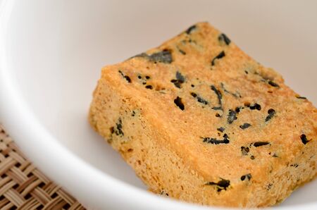 A piece of delicious Japanese confectionery on off white ceramic plate on wooden table. Selective focus.