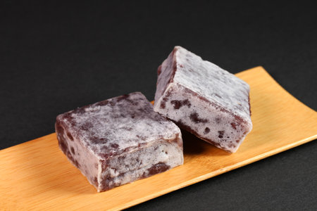 Japanese sweets Kintsuba on a bamboo plate. Kintsuba is sweetened red beans wrapped in wheat flour dough.