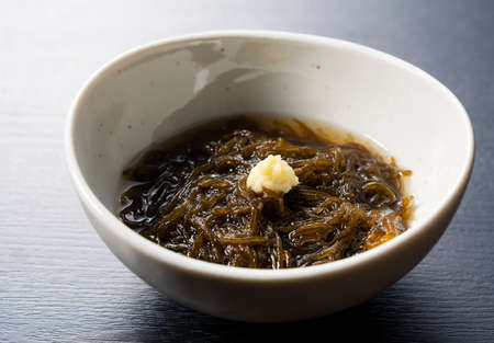 A mozuku seaweed placed on a black background.Mozuku is an Okinawan delicacy. It is a kind of dark, thread-like seaweed seasoned with vinegar