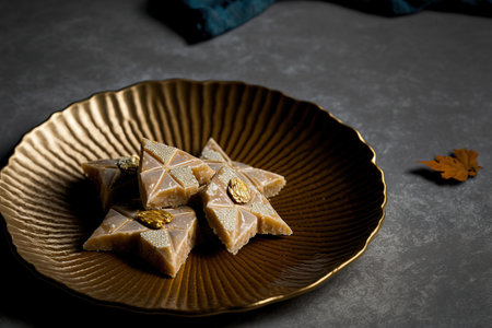 Kaju Katli, an Indian dessert in the shape of a diamond that is created with cashew sugar and mava and presented on a dish or bowl against a gloomy backdrop. discerning concentration