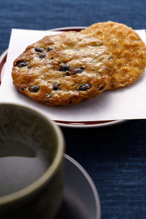 Japanese traditional confection rice crackers and hot Japanese tea