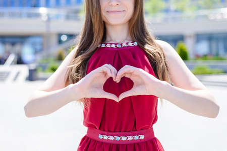 Positive trip vacation rest relax lifestyle sun sunny shine feelings emotions summer concept. Cropped close up photo portrait of pretty beautiful lady making heard with fingers city background