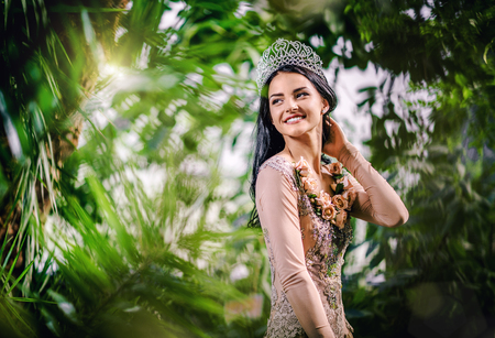 Gorgeous young 20s woman wearing long evening elegant dress and tiara on head posing surrounded by lush tropical foliage trees. Beauty, make up and fashionable store clothes ad for life event concept