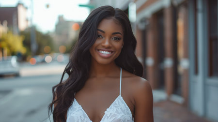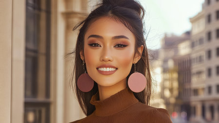A young woman stands in a bustling city street showcasing her radiant smile. She wears a fashionable brown top and large pink earrings enjoying the vibrant ambiance of the urban landscape.