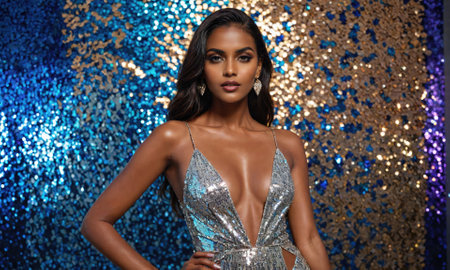 A woman with long black hair poses in a sparkly silver dress against a blue and gold sequined background