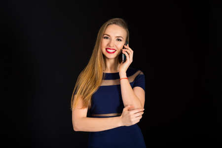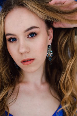 Young beautiful curly women in blue glitter dress on dark background. Copyspace. Concept celebration
