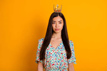 Portrait of young good looking selfish lady with crown on head wear floral print dress isolated on yellow color background