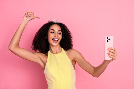 Young woman in a yellow dress taking a selfie wearing a tiara on a pink background, smiling and celebrating joyfully.