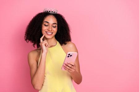 Elegant woman with crown in stylish yellow dress using phone against pink background, enjoying the moment with a cheerful smile