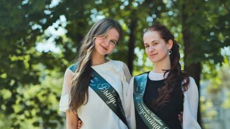 Two Russian schoolgirls graduate posing on a summer day.