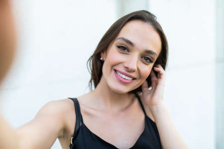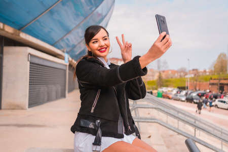 Young caucasian girl with white shirt and black leather boots. Enjoying the holidays in the city, making a selfie with the symbol of