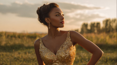 A woman in a shimmering golden dress poses gracefully against a beautiful sunset field background.