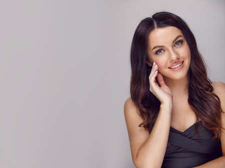 Beautiful brunette smiling woman with a long hair on a grey isolated background with a free copy space.